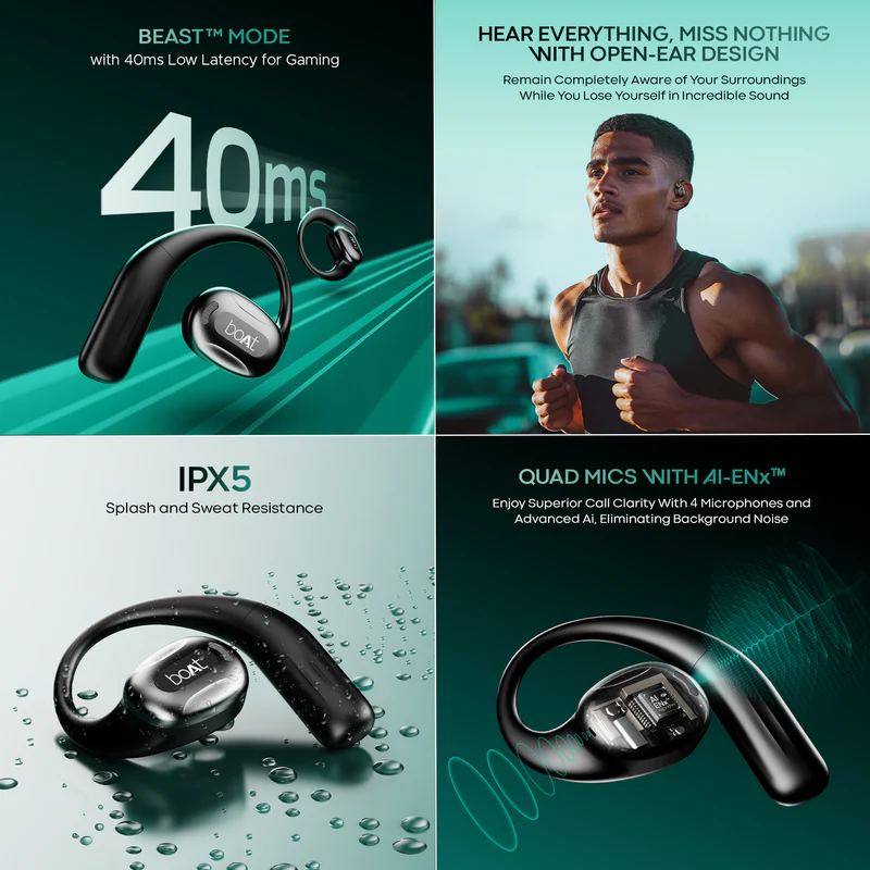 | Product Features | 100 hours of Playtime, 15 mm Drivers with boAt Signature Sound, 4 Mics with AI-ENx™, Air Conduction Technology |