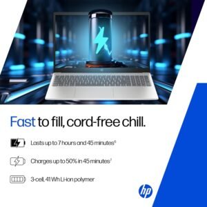 - 【Long-lasting battery】The 3-cell, 41Wh battery offers extended usage for up to 7 hours and 45 minutes. Stay unplugged and productive throughout your day with HP Fast Charge support.