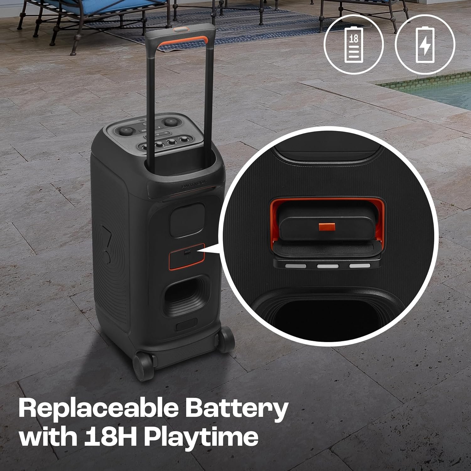 - ✅ Up to 18 hours of play time Party from dusk till dawn with up to 18 hours of play time on a single charge. And if that’s not enough, just swap out the replaceable battery* and keep on dancing. Or if you just need an extra boost, 10 minutes fast charge gets you an extra 2 hours of playtime