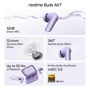 Be the first to review “realme Buds Air 7, 12.4mm Dynamic Bass Drivers,52Hrs Playtime, 52dB Hybrid ANC,6 Mic ENC, 45ms Low Latency, 360° Spatial Audio, Hi-Res LHDC, IP55 Dust & Water Resistant, BT v5.4 (Lavender Purple)”